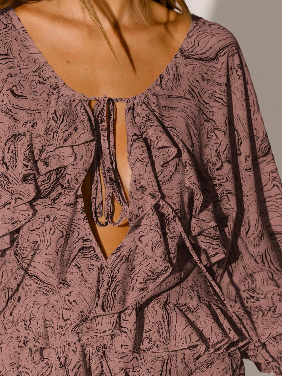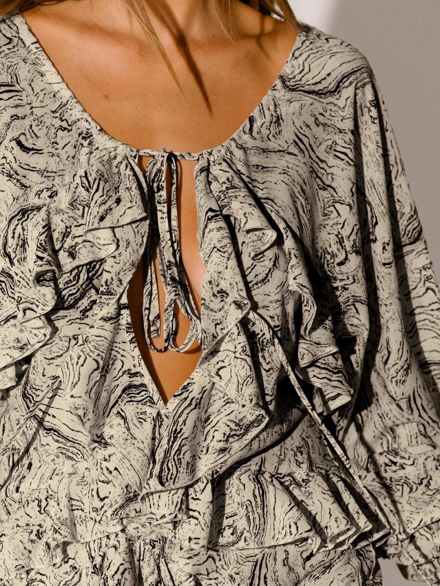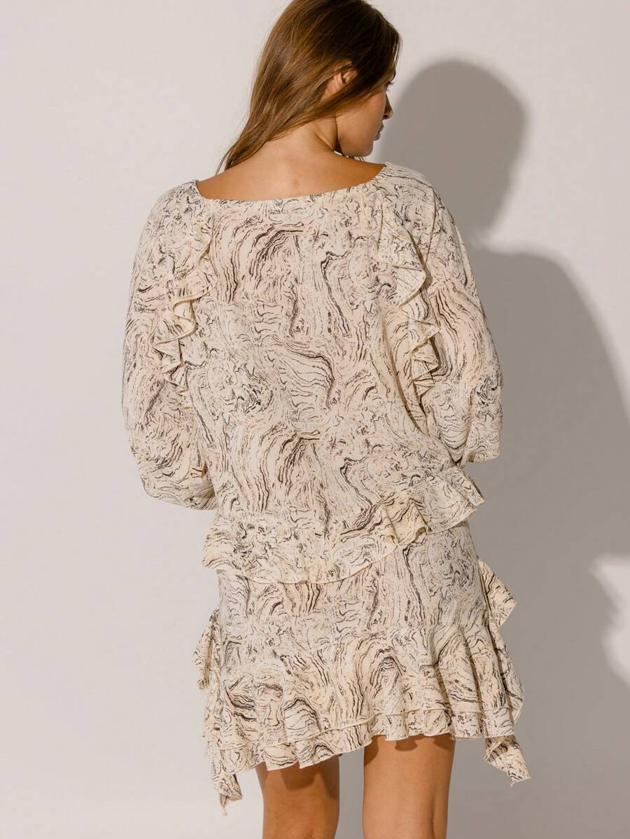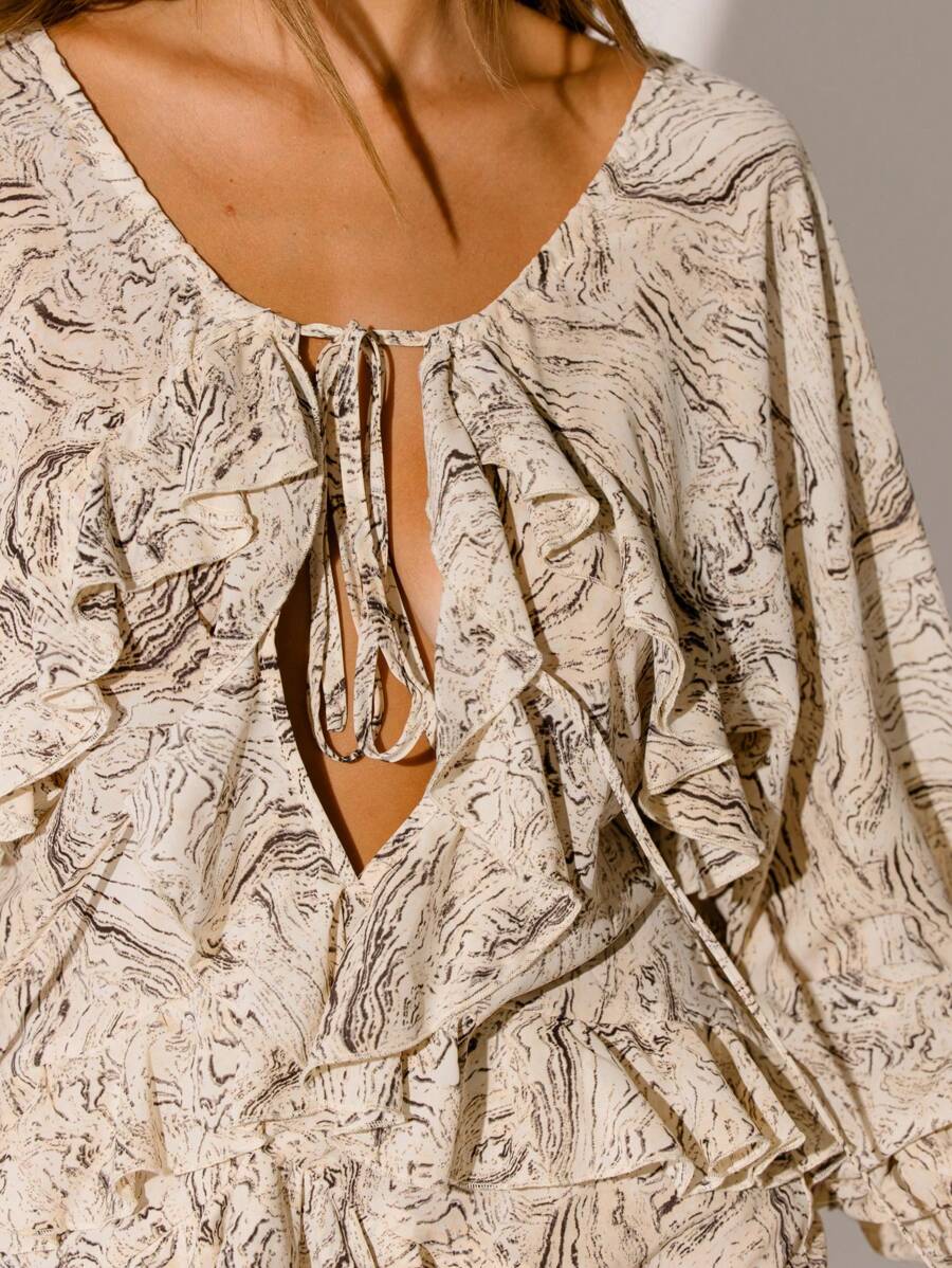 Romantic Details: Ruffled accents and a delicate floral print create an effortlessly feminine vibe.