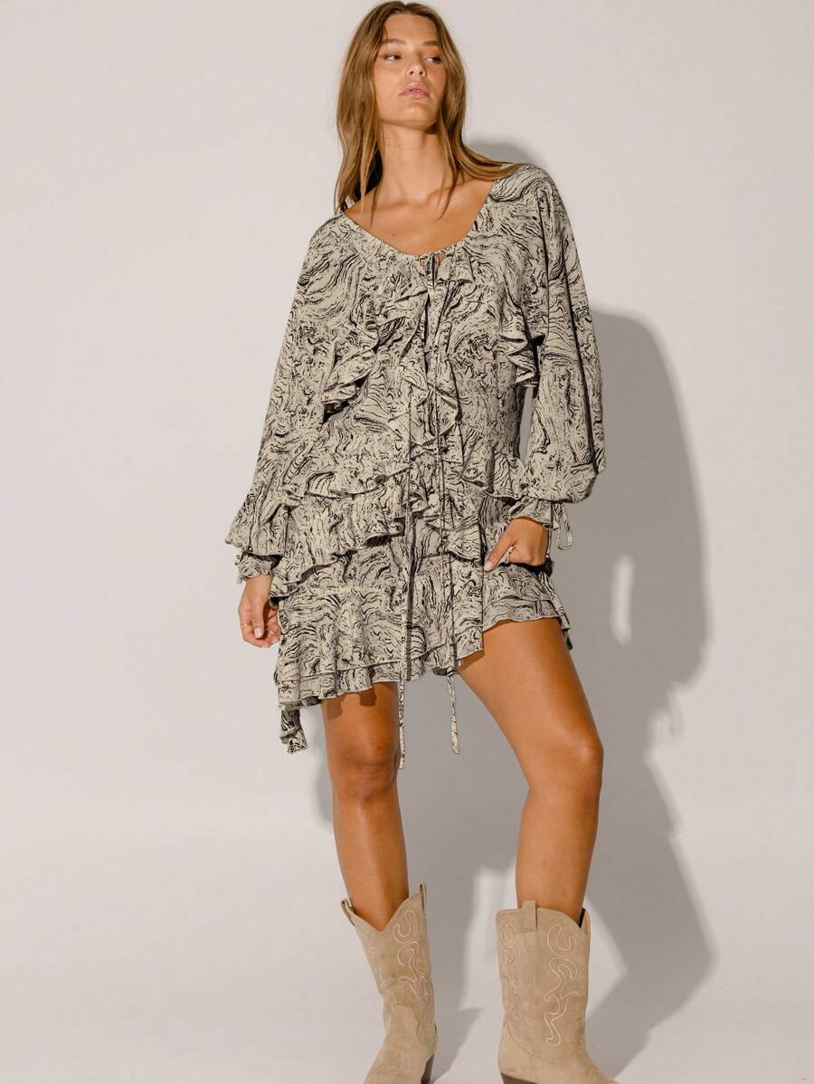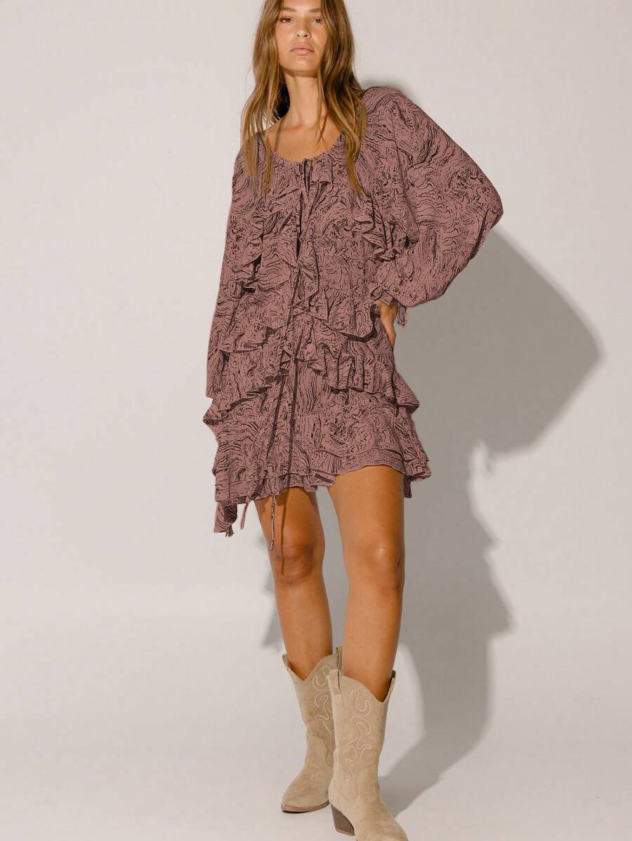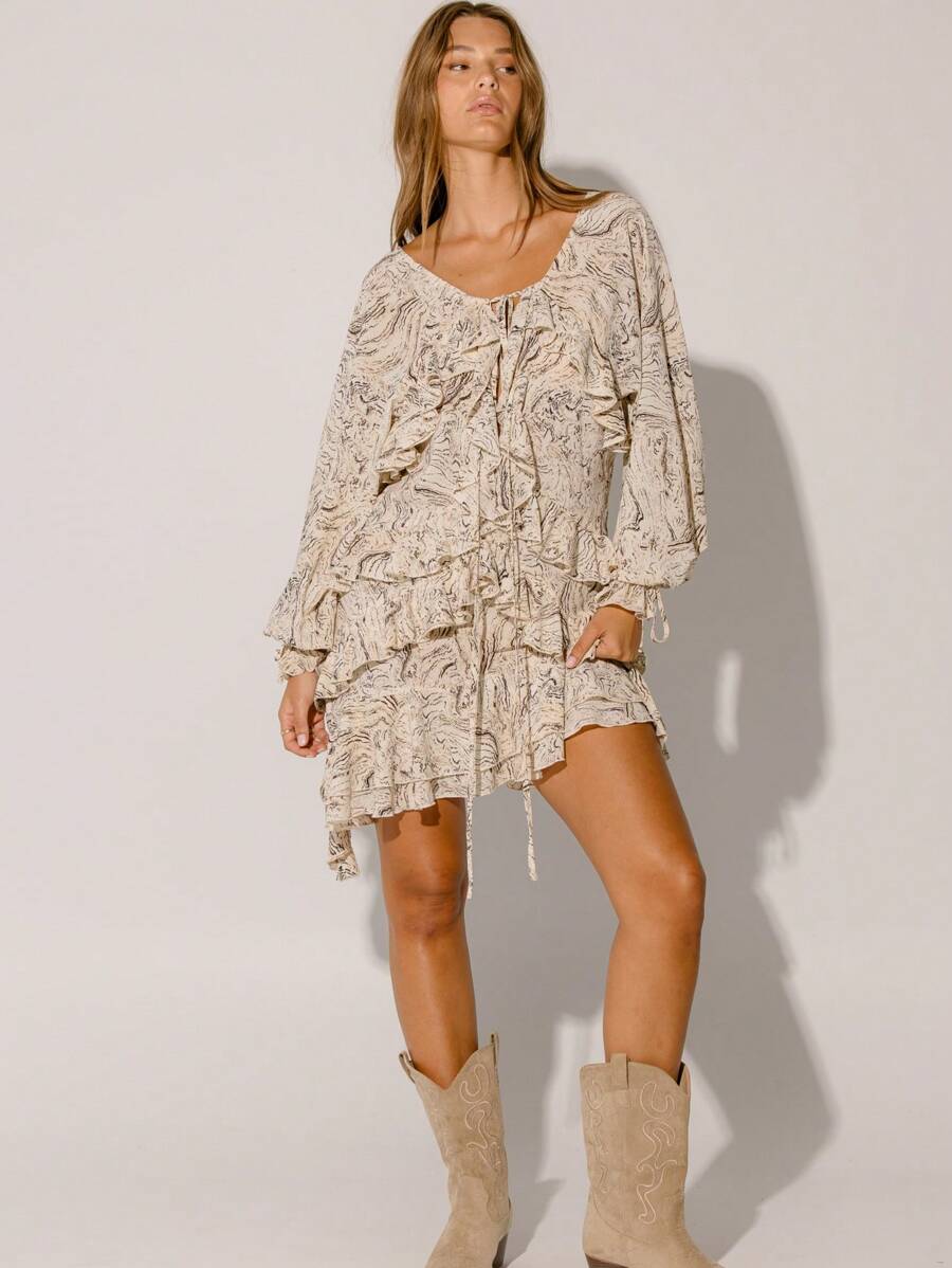 Floral Ruffle Tiered Flowy Silhouette Boho Style Long Sleeve Mini Dress