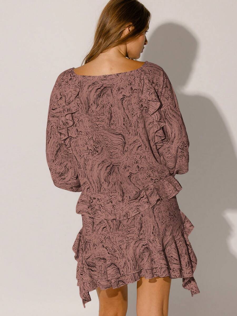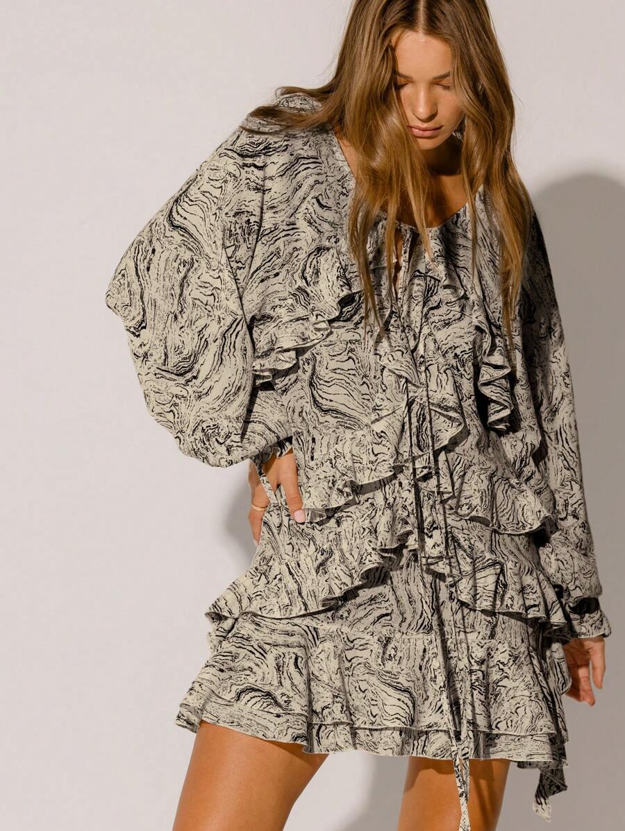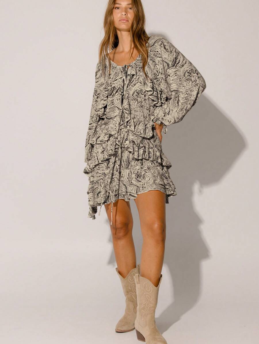 Floral Ruffle Tiered Flowy Silhouette Boho Style Long Sleeve Mini Dress