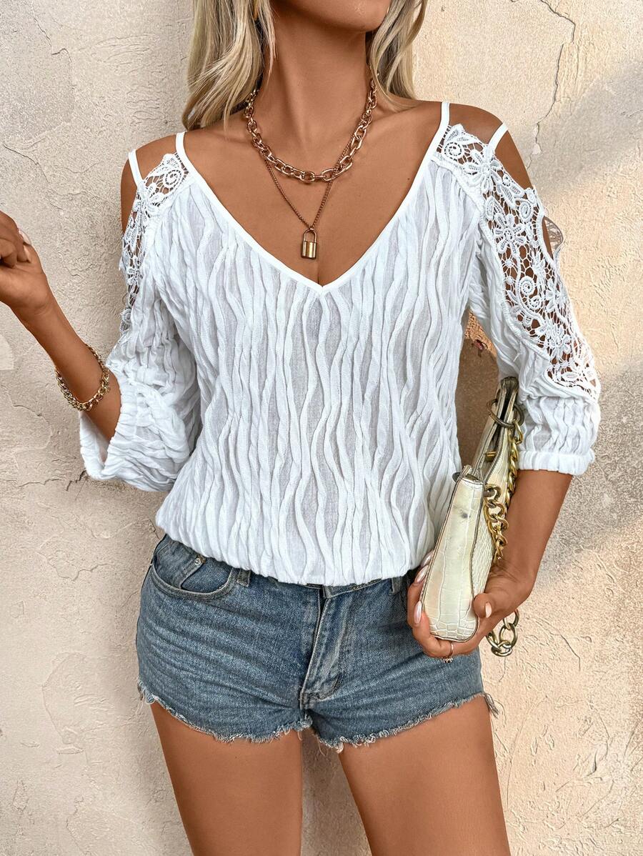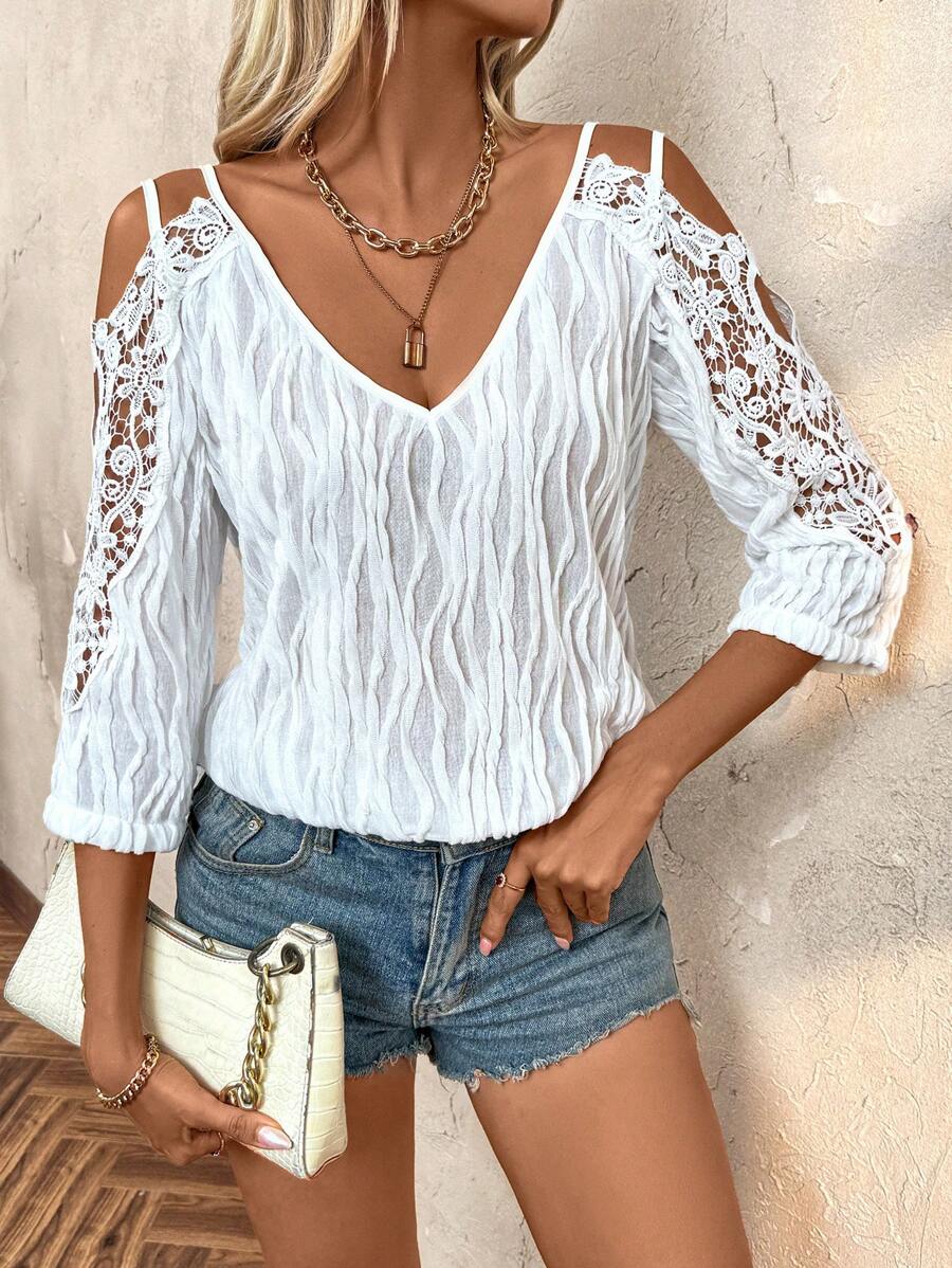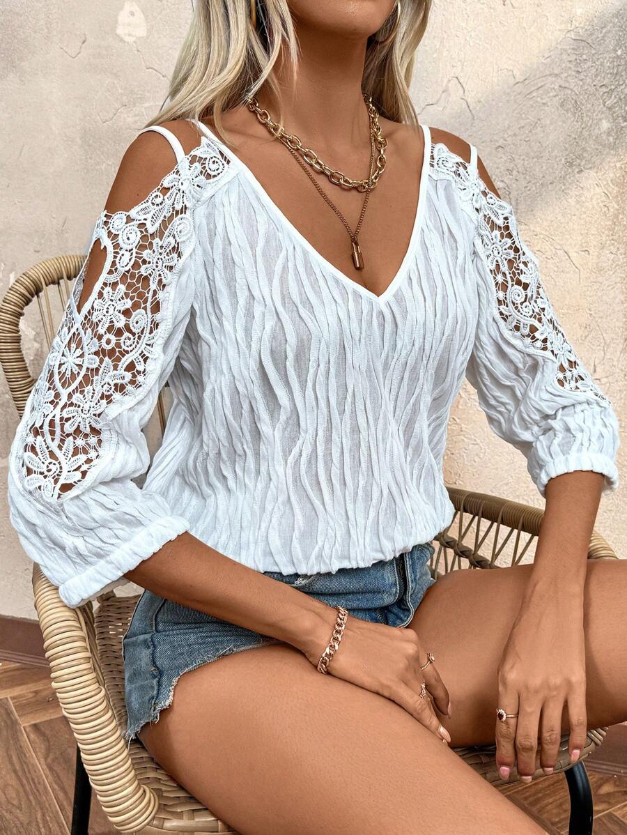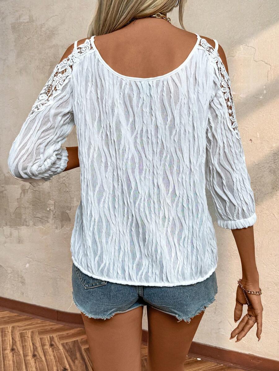 Women's Summer Lace Spliced Open Shoulder Loose Fit Elegant Blouse With 3/4 Sleeves