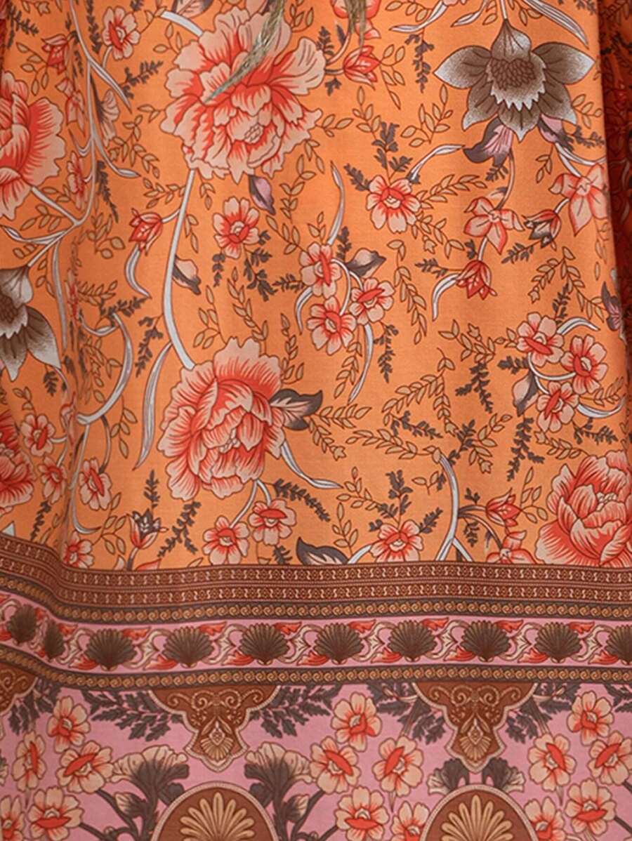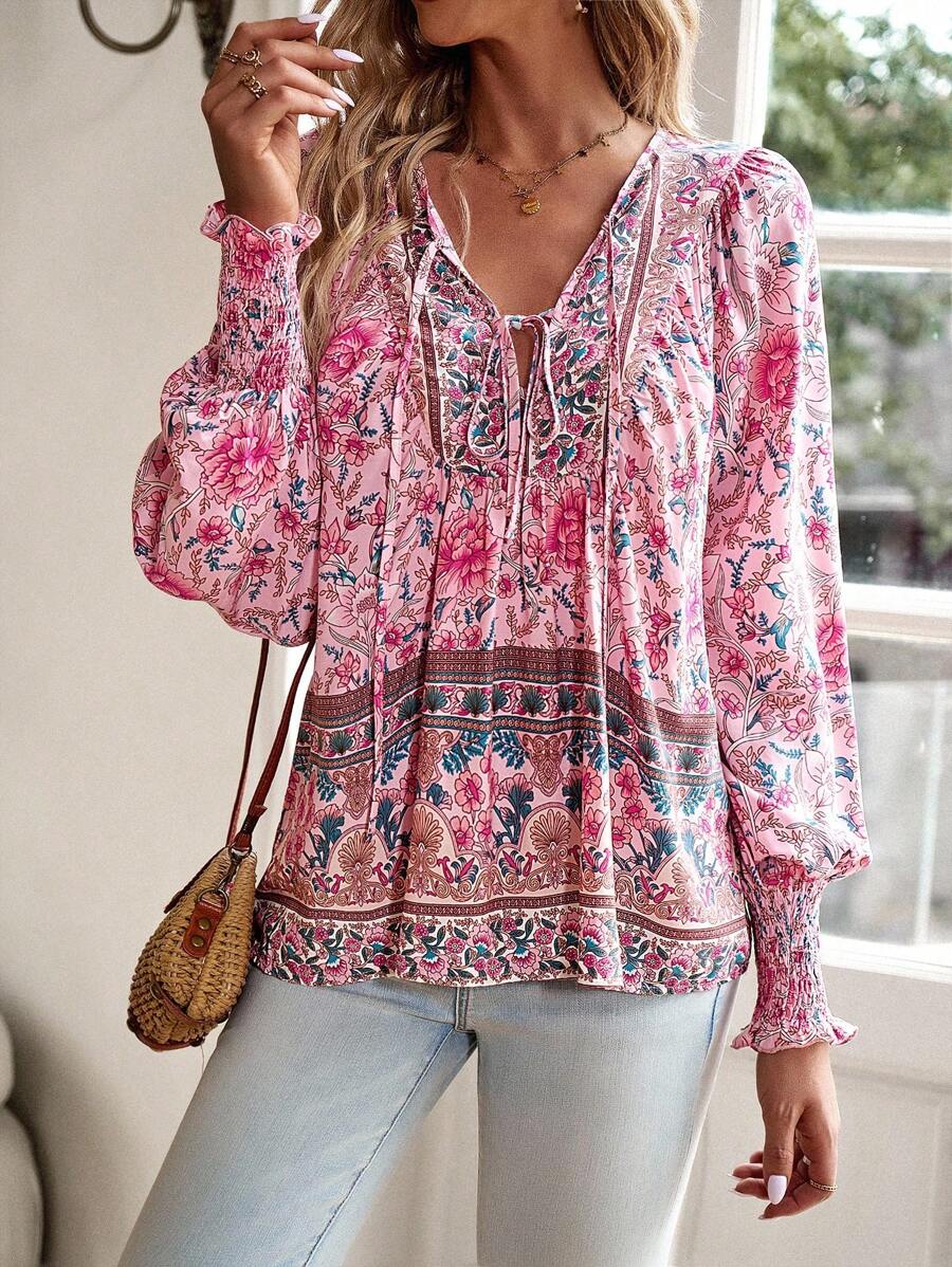 Women's Floral Print Shirred Cuffed Shirt Fall Cloth For Women
