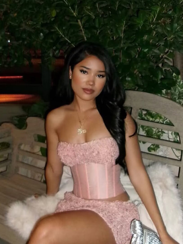 This striking two-piece set features a sleek bandeau top and a figure-hugging mini skirt that perfectly accentuates your curves, creating a flawless silhouette that embodies both elegance and allure.